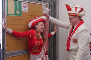 Als erste Band treten die Klüngelköpp auf, ruckzuck stehen die ersten Frauen auf den Bänken. Vor der Bühne wird getanzt. Gesang aus 1000 Kehlen. Die Temperatur im Saal steigt minütlich. Der Holzboden vibriert. Wie hält man eine solche Stimmung bildlich fest? Während die Bands spielen, ist es ziemlich dunkel im Saal. Kameramann Tom Wegner hat ein Problem: „Wenn ich mit einem Headlight an der Kamera arbeite, dann sieht es aus wie Tagesschau. Und man will den Leuten auch nicht ins Gesicht leuchten, während sie feiern.“ So müssen er und sein Kollege Jürgen Behrens mit der Lichtempfindlichkeit ihrer Kameras an die Grenze gehen. Der Gang durchs Spalier ist quasi das Markenzeichen der Sitzung. Eine Erfahrung, die Christoph Simon und Tom Wegner den Fernsehzuschauern gerne vermitteln möchten. „Wir haben zwei kleine Action-Kameras an eine Stange montiert, die sich wie ein Rotor an einem Stativ dreht“, erklärt Wegner, „damit werden wir gleich durchs Spalier bis zur Bühne durch den Saal gehen.“
